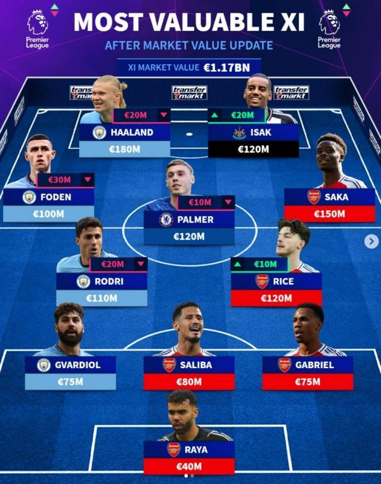 德转列英超最贵阵:哈兰德、萨卡领衔,曼城+枪手9人在列